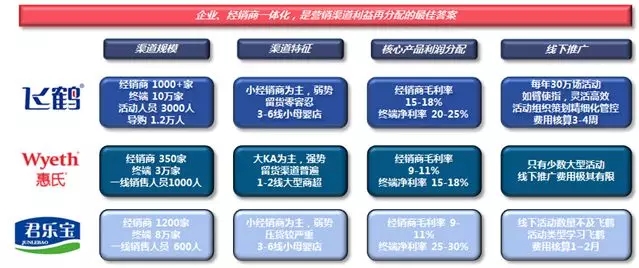 与之相比美赞臣、雀巢、惠氏等外资品牌,一直到17、18年才逐渐认识到下沉市场的重要意义和重要性,但却苦于始终找不到和经销商有效的合作模式;而国内品牌君乐宝、伊利、雅力士等,和经销商都采用销售确认制,不对经销商的销售模式、推广方案、投放区域、费效提升做管理和把控,只是把经销商作为自己确认收入的对象,而飞鹤却聚集了上千个和自己品牌绑定的经销商。
